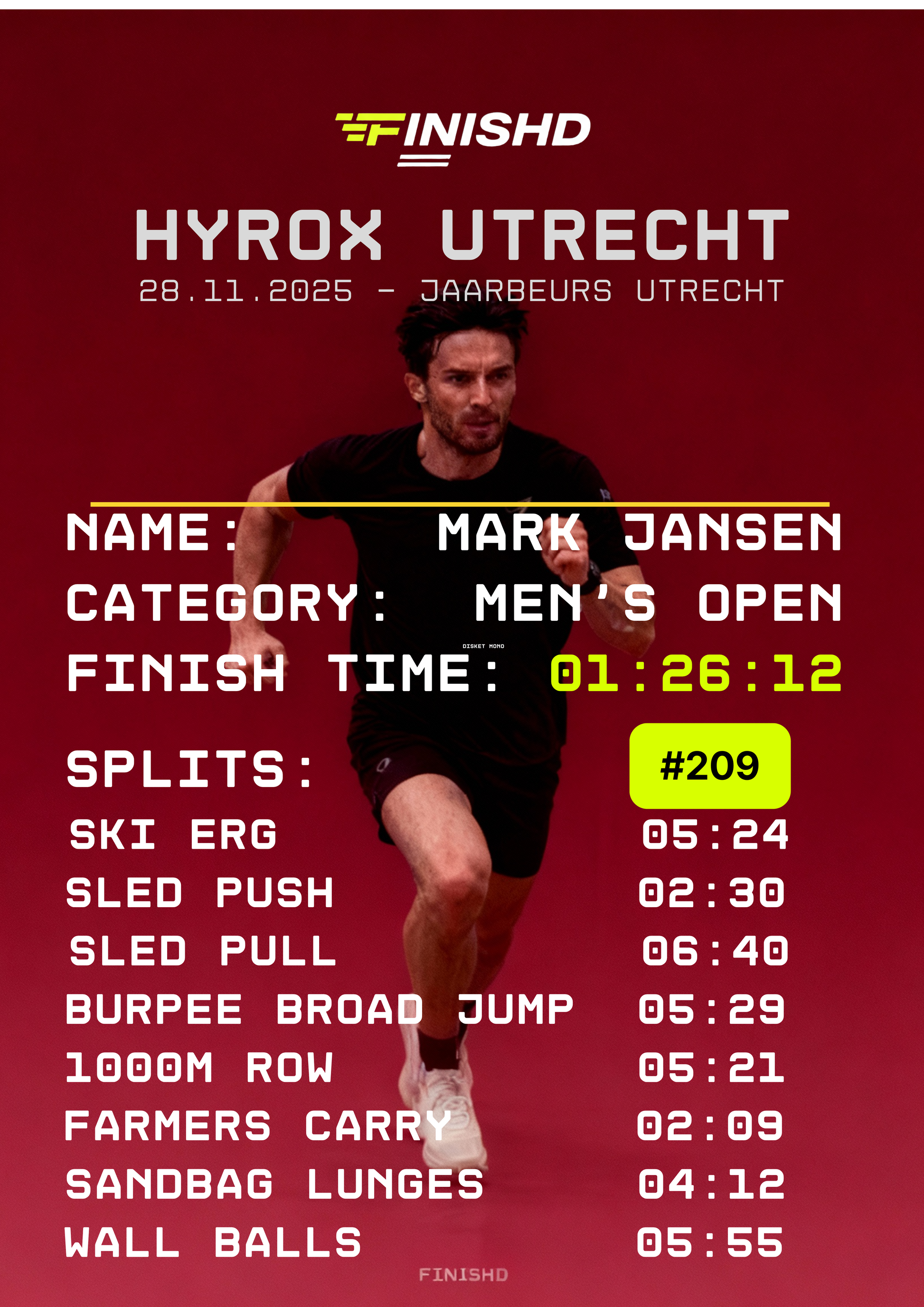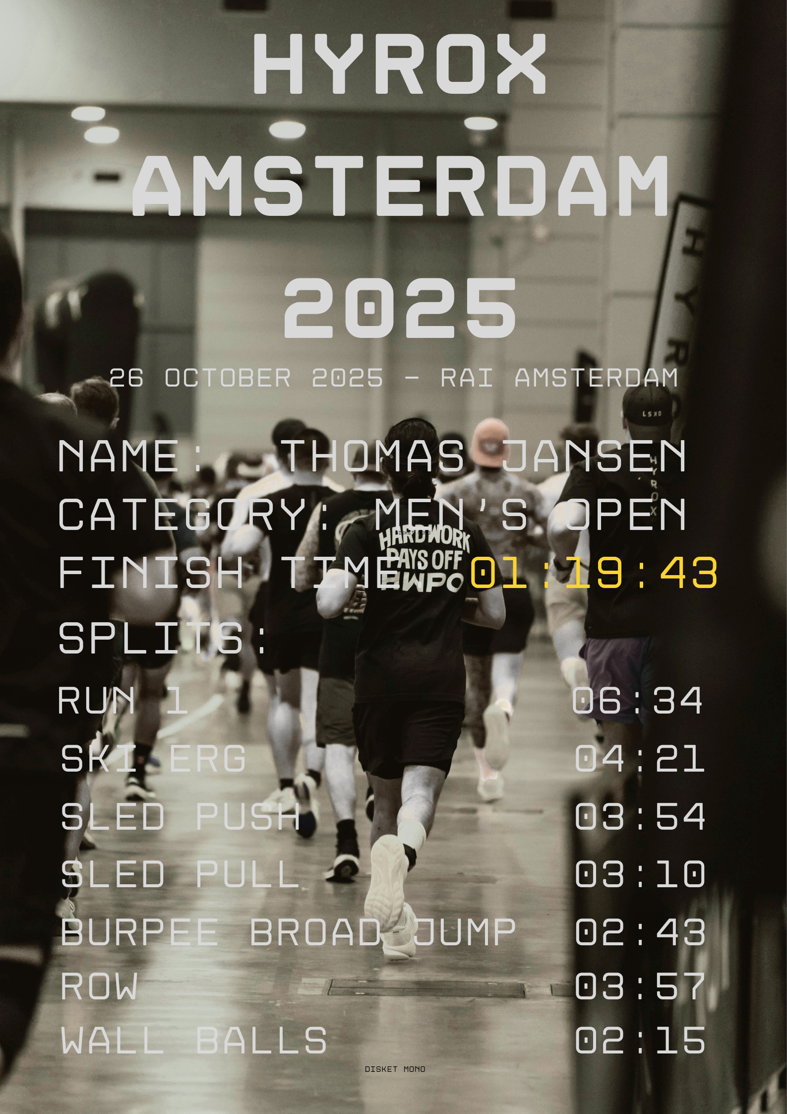 Ik heb de Photo Edition besteld na mijn HYROX in Amsterdam, en ik ben echt onder de indruk van hoe mooi het resultaat is. De kwaliteit van de poster is top, heldere kleuren en mijn eigen foto komt er superstrak op uit. Alles klopt: mijn naam, de locatie, de tijden, zelfs de kleine details van de splits staan erop.